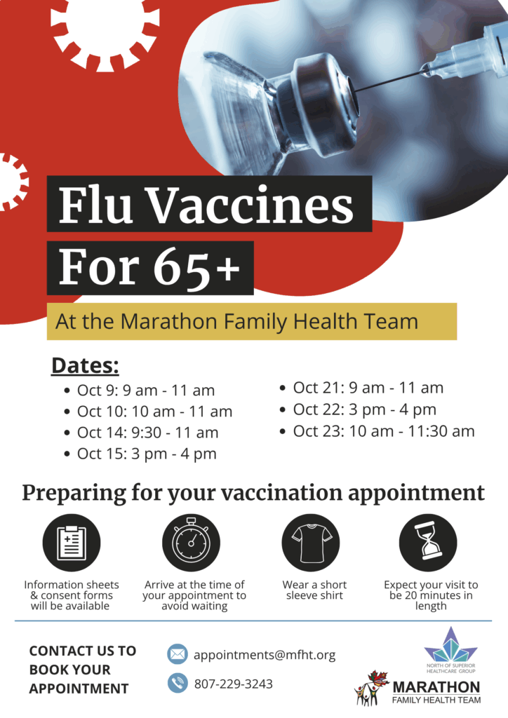 The Marathon Family Health Team (MFHT) and North of Superior Healthcare Group (NOSH) will be hosting community flu clinics from October 9 to 23 for adults 65 and older at the MFHT clinic.To book your appointment, call 807-229-3243 or email appointments@mfht.org.
