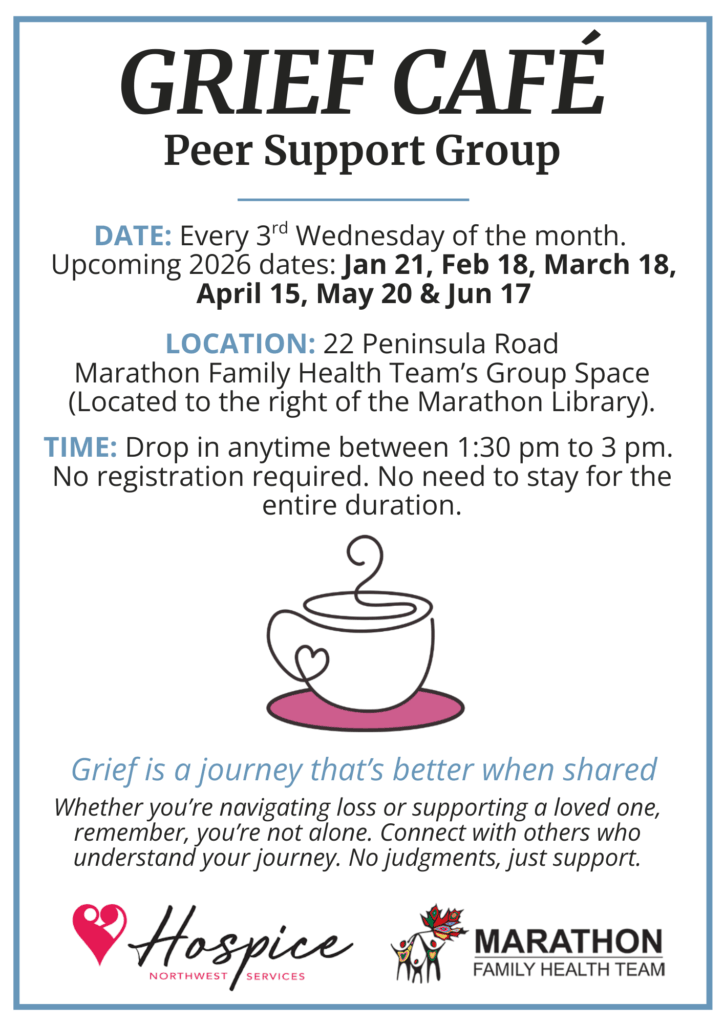 Grief Café is a safe, supportive, peer lead group that offers compassionate ears and open hearts. It is a place to share your stories, experiences, thoughts, feelings, and fears. Grief Cafe is drop-in! No registration required.